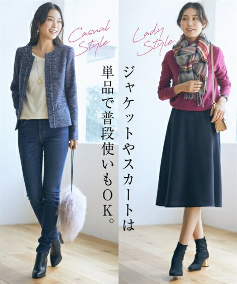 素材 品質=ポリエステル100%(織物 ジャケット:ツイード スカート:アムンゼン) [裏地]有(総裏) ジャケット:肩パッド付 前ホック開 ポケット前2つ スカート:後ファスナー ウエスト両脇ゴム入 この商品は2点同サイズのみで販売します。